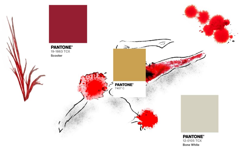Se empleó una paleta de color pensada en la representación de algunos factores representativos del cuerpo. un viaje entendiendo la composiciòn y sucesión entre el hueso, la carne, la piel y el ser puro y etereo.